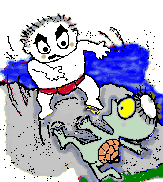 小川原のせというところに、とみへいじさんちいうひとがおったげな。 「とみへいじいさん」ち、だれか声をかけちきた。 あたりをきょろきょろみまわしちんだれもおらん。 「すもうとろうぇ」ち、いうげな。 「すこうなんのたったこつがねえき、つまらんつまらん」ち、 「すもうとろうぇ」ち、 じいさんが気味わるなっち走り出すと、カッパも川から上って、 日は暮るるし、あたりはくろうなるし、じいさんは気が狂うたごっなって 「こりゃ、どうしたもんじゃろうか」ち、 そしたらばあさんが、 そしたらどうしたこつか、じいさんの目がぴかーぴかーっち光だして、 それからのち、このあたりじゃカッパが、 |