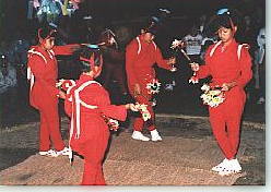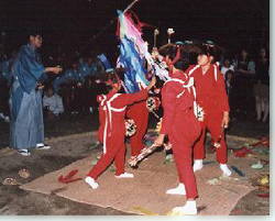 この神事は、神意と慰め、無病息災、豊穣を祈るために催されるもので、有名な有田郷の千人踊り、(須の原踊り)の一連のものです。 10月仲秋の夜、大行事神社前の庭で行なわれ、夕暮ともなれば、采振り、棒使い、コモラシ(子ども河童)、楽人、氏子等三十数名が、近くの堂山の仮屋にあつまり、豊穣の田んぼ道を、たいまつをかかげながら、行列をつくって神社まで行進します。 神前では裃をつけて威儀を正した五色の御幣を持った長老の指図によって、太鼓、横笛、鉦、ビジャシャラ等の、いとものんぴりした楽の音につれて、まず棒使いの青年が棒踊りを行ない、つぎに河童(少年が扮する)4人が、赤褐色の衣袴をつけ、シュロの皮でつくったお皿を頭にいただき、2枚のむしろの四隅にたって、御幣をかついで踊ったり、腹の上の小太鼓をたたいて、とんだり、はねたり、とんぼ返りをして踊ります この踊りは、そのむかし、大原八幅宮の神馬が石松川を渡ろうとしたとき、石松川に住む河童が神馬にいたずらをしかけたので、神馬が怒り、河童をしばりつけて引き回しました,河童は驚いて、踊りを奉納するから許してもらいたいとお託ぴしたのが始まりだといい伝えられています。 |