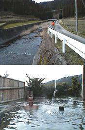 2時間程度楽しだ後は岳の湯温泉へ、樅木川を上流に走ると農免道路が開通していますので 涌蓋山をバックに素晴らしい景色を見ながら温泉へ、バス停のおばちゃんに頼み、後のお客さんをストップしてもらい露天風呂へ、打たせ湯が熱かった。温泉タマゴが5分でできるのを待って近道の山道を走りかえりました(^o^; 岳の湯温泉 涌蓋山の登山道にある温泉、共同浴場はないので、バス停(お店)の露天風呂(混浴200円)か近くの宿のお風呂で入浴できる。 単純硫黄泉で神経痛やリュウマチに効果があるそうです。泉源はの温度が高いので気をつけて入浴しましょう。