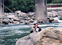 温泉街満員の為、上流の湯の釣温泉へ移動、休憩して12時頃釣り始めたら、プロ軍団がやってきた、撮影は下流の見えない場所でやるらしくホ〜 プロの横でなんて恥ずかしくてデキマセン. 一週間後、三隈川で24・23cmをゲット・・・今年も相変わらず貧果(ヘタ)