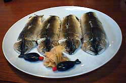 嬉しいがどないしよう 持ってきた網は短い鮎ダモで水面に届くわけもない、仕方なくモイカを防波堤の低い方に誘導し、女房に這いつくばってタモ入れしてもらう 12時納竿 釣果&夕食 モイカ2ハイ 刺身