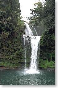 JR杉河内駅横にある。 郡境に位置し、山浦渓谷の清冽な水を集め玖珠川との 合流点付近で落下する、2重の滝で水量多く豪快な滝 であり、滝壺の裏が歩け夏の納涼の格好の場である。 滝の上流は河のりの産地で、全国で26ヶ所の内 大分県3ヶ所の一つかここである。 慈恩の滝には昔、大蛇が大暴れしたとき旅の層が訪れ その大蛇の病を治し、田畑を荒らす大蛇の害がそれ以 来なくなった伝説があります。 下流は有名な三州峡の名勝であり、河岸の岩壁は紅葉 に映え、杉の緑も美しい。 |